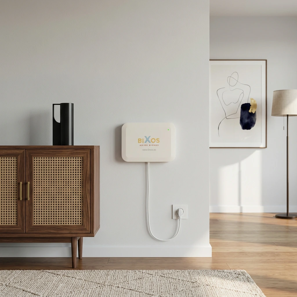 Instalación rápida y funcionamiento continuo. BiXos se orienta a reducir humedad por capilaridad y a mejorar las condiciones del entorno. Como plus, aporta un efecto disuasorio auxiliar para insectos asociados a zonas húmedas en paredes y estructuras.